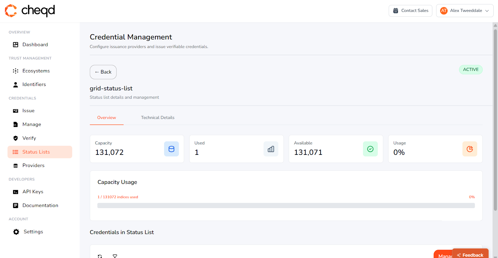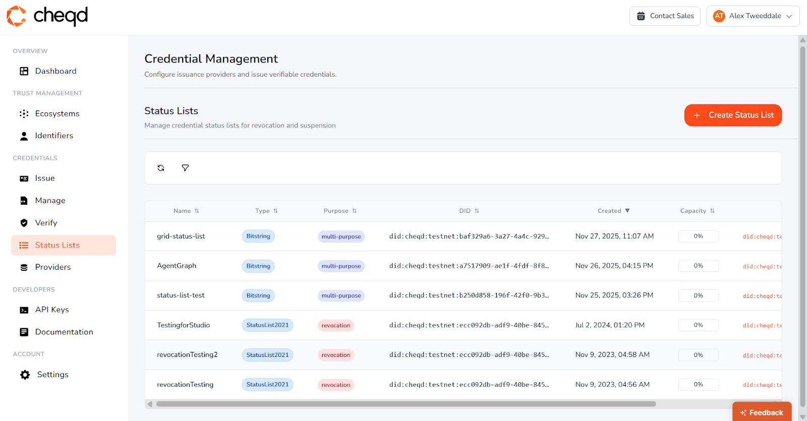 Through this work on the SDK, we have made a series of improvements to cheqd Studio and the latest user interface. Firstly, users should now be able to see our Status Lists tab, where it is possible to create and manage individual status lists for different purposes.